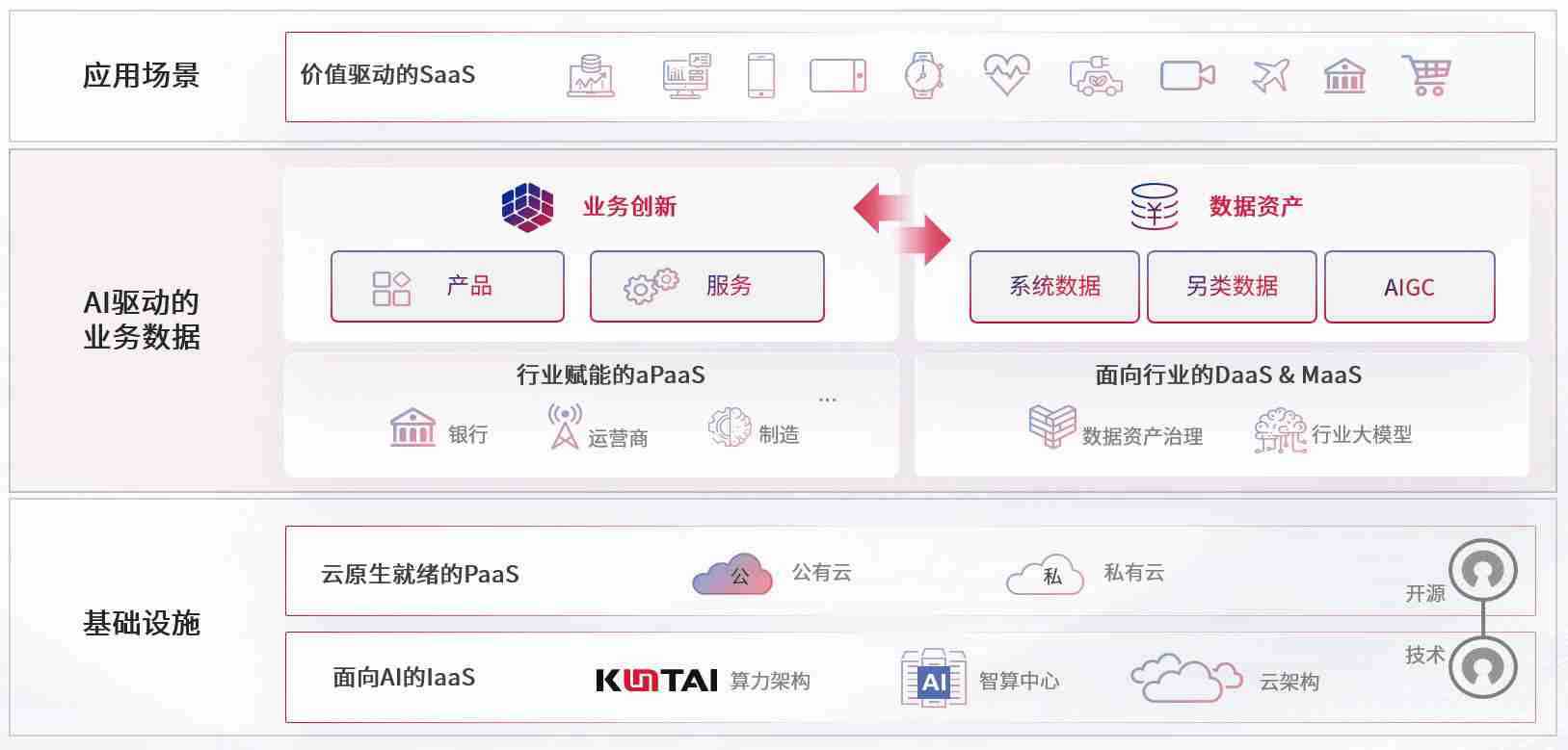 数字时代,,,围绕企业数字化转型的关键要素,,z6com尊龙凯时数码开创性的提出数云融合战略和技术体系框架,,,着力在云原生、、数字原生、、AI原生和信创产业上架构产品和服务能力,,,为处在不同数字化转型阶段的快消零售、、、汽车、、、、金融、、、、医疗、、、、政企、、教育、、、运营商等行业客户提供泛在的敏捷IT能力和融合的数据驱动能力,,构建跨界融合创新的数字业务场景和新业务模式,,助力企业级客户建立面向未来的核心能力和竞争优势,,全面推动社会的数字化、、智能化转型升级。。