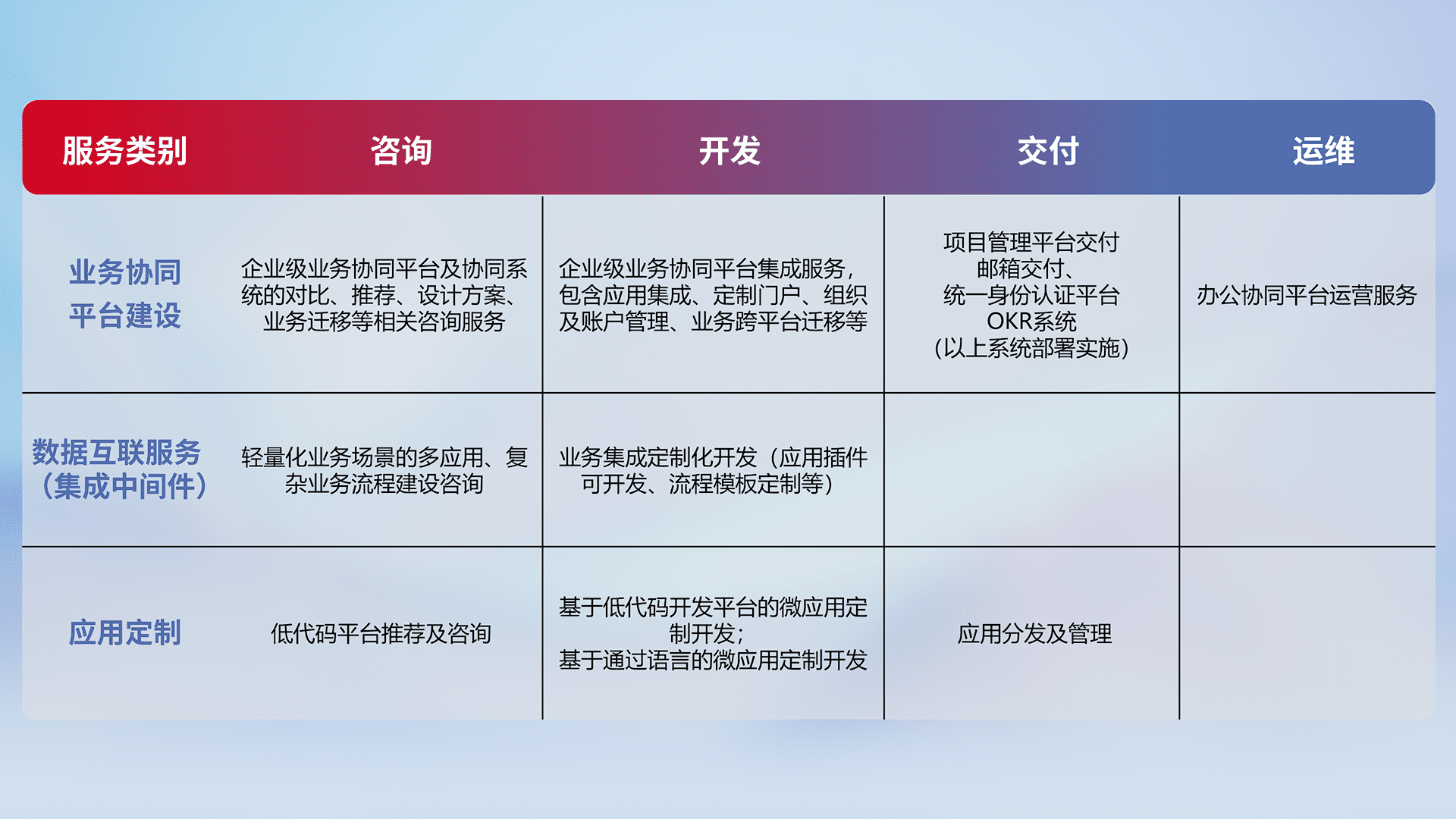 针对钉钉、、企微、、、IDaas等平台级产品提供产品的规划、、、方案、、交付、、、、定制化开发等服务,,,实现如统一协同办公、、智能客户服务、、、混合会议管理、、、、智能数据查询、、、、等业务场景,,实现数字化转型。。。